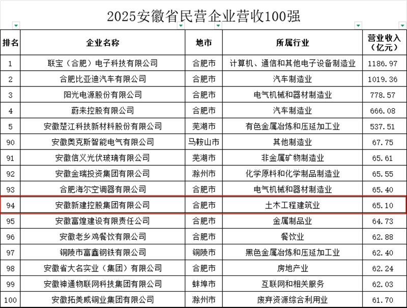 10月16日上午,2025年安徽省民營企業(yè)百強發(fā)布會在合肥隆重舉行。安徽省工商聯(lián)、省發(fā)改委、省工信廳、省市場監(jiān)管局及省人力資源和社會保障廳聯(lián)合發(fā)布了2025年安徽省民營企業(yè)營收百強、制造業(yè)百強和服務業(yè)百強榜單。安徽新建控股集團在2025年安徽省民營企業(yè)營收百強榜單中位列第94位,這一成績取得充分展現(xiàn)了集團公司不斷增強的綜合實力。